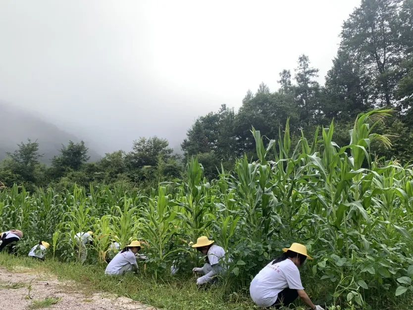 紧接着实践队分为三队,在产学研基地进行研学实践及义务劳动,男生们手持镰刀,进入玉米地进行除草;女生们手持剪刀,进入西红柿培育棚剪掉枯枝烂叶,她们在梁龙教授的指导下学会了如何对生病的西红柿枝进行修剪,剪下了被病毒感染而枯萎或被害虫损伤的枝叶。在义务劳动中,大家的手套被水滴浸湿,手臂上满是被杂草割伤以及被蚊虫叮咬的痕迹。面对玉米地的杂草西红柿的枯枝烂叶,没有一个人怕脏喊累,个个满头大汗,呈现出一幅热火朝天的场景。