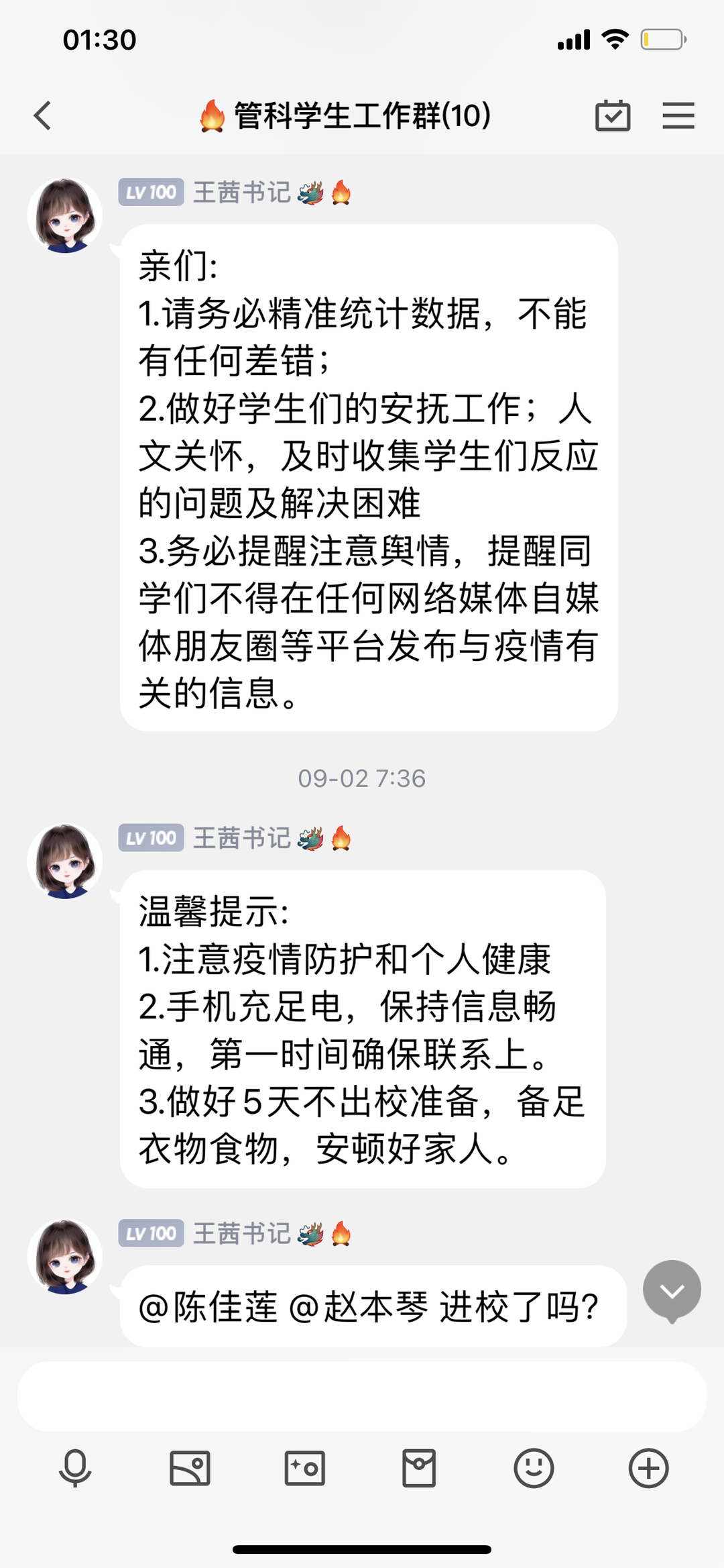 在实行静默管理期间,yl23455永利的领导和老师以身作则,挺身而出。9月1日晚至今,管科公司返校到岗的领导老师有党委书记邵新顺、已调往招就处但仍在履行员工管理职责的原党委副书记王茜、员工科负责人李炳芳、专职组织员罗红艳,以及辅导员陈佳莲、姚吟吟、吴德凤、曾建霞(新入职的专任教师)等八名同志按照公司的统一安排部署,展开了所负责点位的全员核酸检测工作,并到员工宿舍走访进行思想政治工作,及时将公司的通知要求传达到公司师生。因静默管理不能到校的辅导员吴沛丽、赵本琴、院办公室副主任赵湘婷、教务科科长朱艳飞在家线上办公,公司党政领导班子其他成员及科室负责同志按照分工共同做好了相关工作。