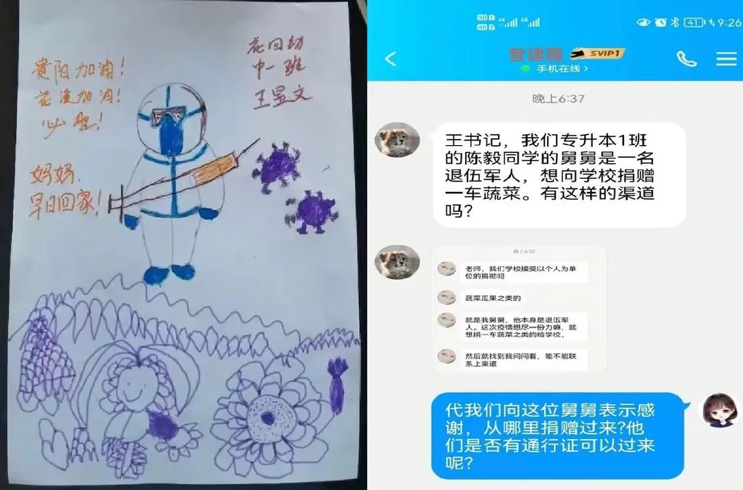 当然,还有一些可爱的人在一直默默的支持那些因在校抗疫留校的师生家属们。公司员工科负责人李炳芳老师每天精准高效统计报送公司员工数据,家里的小女儿过生日也不能回去陪伴,女儿还懂事的给妈妈画了一幅画“贵阳加油,妈妈,早日回家”;公司20级专升本1班新生陈毅的舅舅是一名退伍军人,也是积极沟通公司,希望能向公司捐赠蔬菜,目前公司原党委副书记王茜正在帮助其积极沟通寻找渠道。