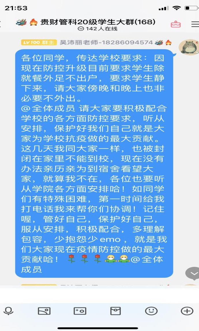 从投入到这场疫情防控阻击战中,公司的领导老师们以他们的实际行动给我们管科学子展示了什么是奉献、什么是责任、什么是担当。公司党委书记邵新顺每天只睡两三个小时,公司的年轻老师让他多休息时,他嘴边总是挂着那句“没事,你们不用担心,你们小年轻也注意身体”;已调往招就处但仍在履行员工管理职责的原党委副书记王茜,现在仍尽职尽责的和大家一起战斗,并经常给大家带来鼓励温暖,她说过一句话“虽然已经下文我现在不在管科,但是交接工作的最后阶段我仍然要站好最后一班岗,做好自己该做的,有始有终,而且,我对管科也很有感情”;几位辅导员老师家里都是两三岁的孩子,但是他们暂时“放弃”了她们的小孩子,去保护好他们的“大孩子们”。
