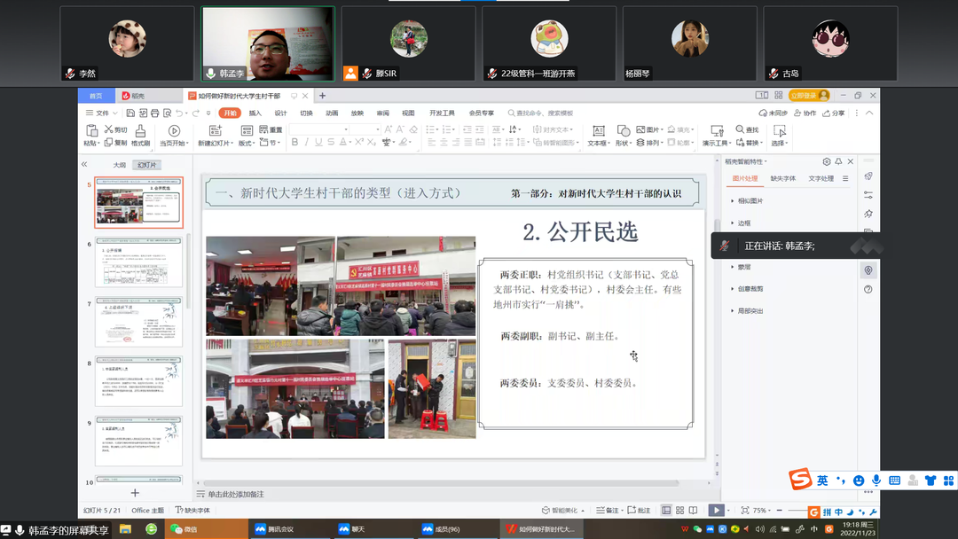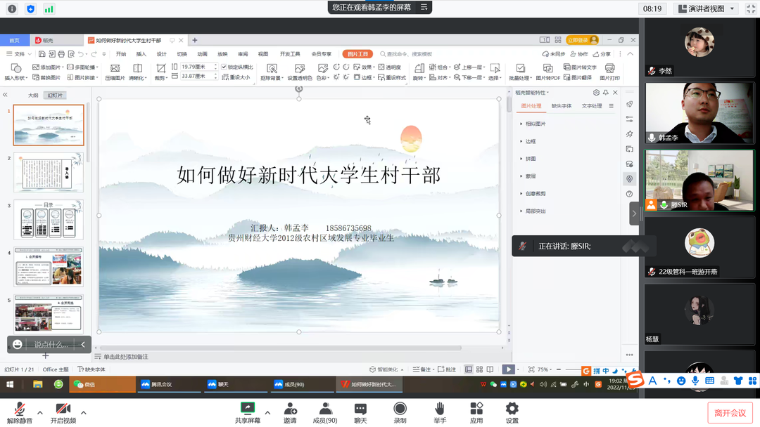 为使广大青年员工深入了解基层工作,同时结合自身专业知识,积极投身贵州乡村建设,服务群众、服务基层、服务农业农村经济发展。11月23日,yl23455永利以线上腾讯会议的形式开展“如何做好新时代老员工村干部”讲座活动。本次活动特邀公司2012级员工、遵义市汇川区芝麻镇高原村党总支部书记、村委会主任韩孟李作为主讲嘉宾,全院一百余名同学参加。此次活动由公司农村发展系主任滕明雨老师主持。
