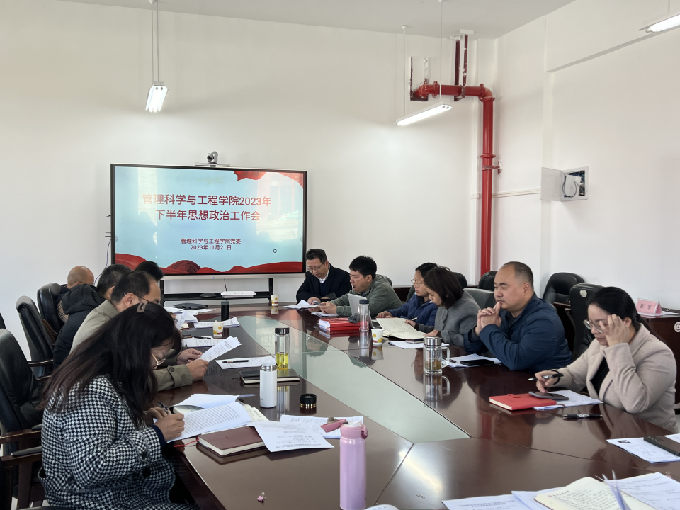 11月21日上午,管理科学与工程公司党委在文溯楼509会议室召开2023年度下半年思想政治工作会。公司领导班子成员、全体系(副)主任、科室负责人、党支部书记参加会议,会议由党委书记邵新顺主持。